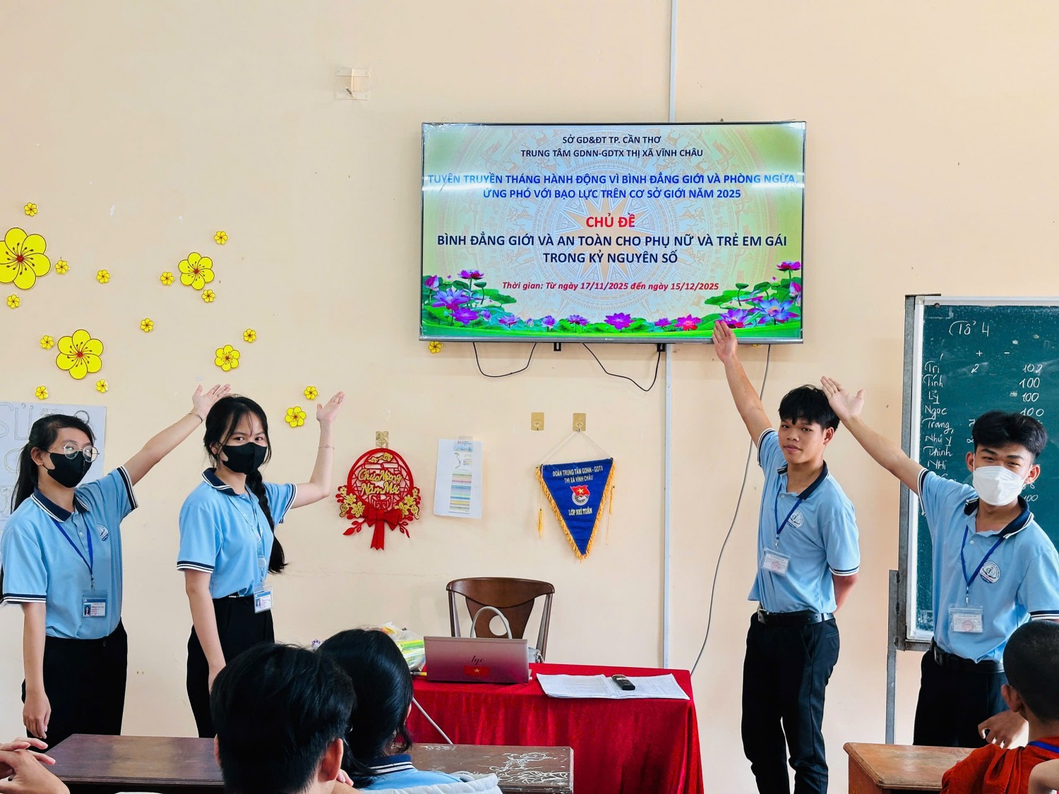 Đoàn Trung tâm phối hợp cùng Tổ Giáo dục thường xuyên (GDTX) đã tổ chức triển khai các nội dung tuyên truyền đến toàn thể giáo viên và học viên trong tiết sinh dưới cờ, đồng thời lồng ghép nội dung bình đẳng giới trong tiết sinh hoạt lớp.