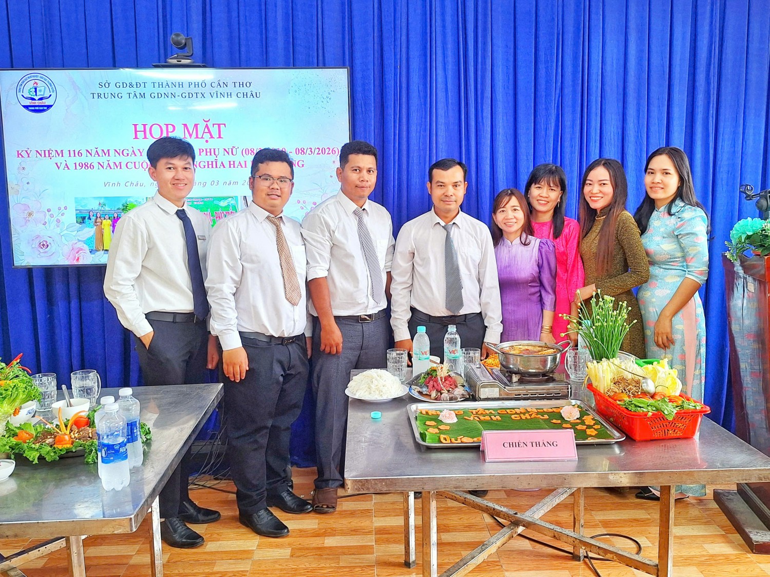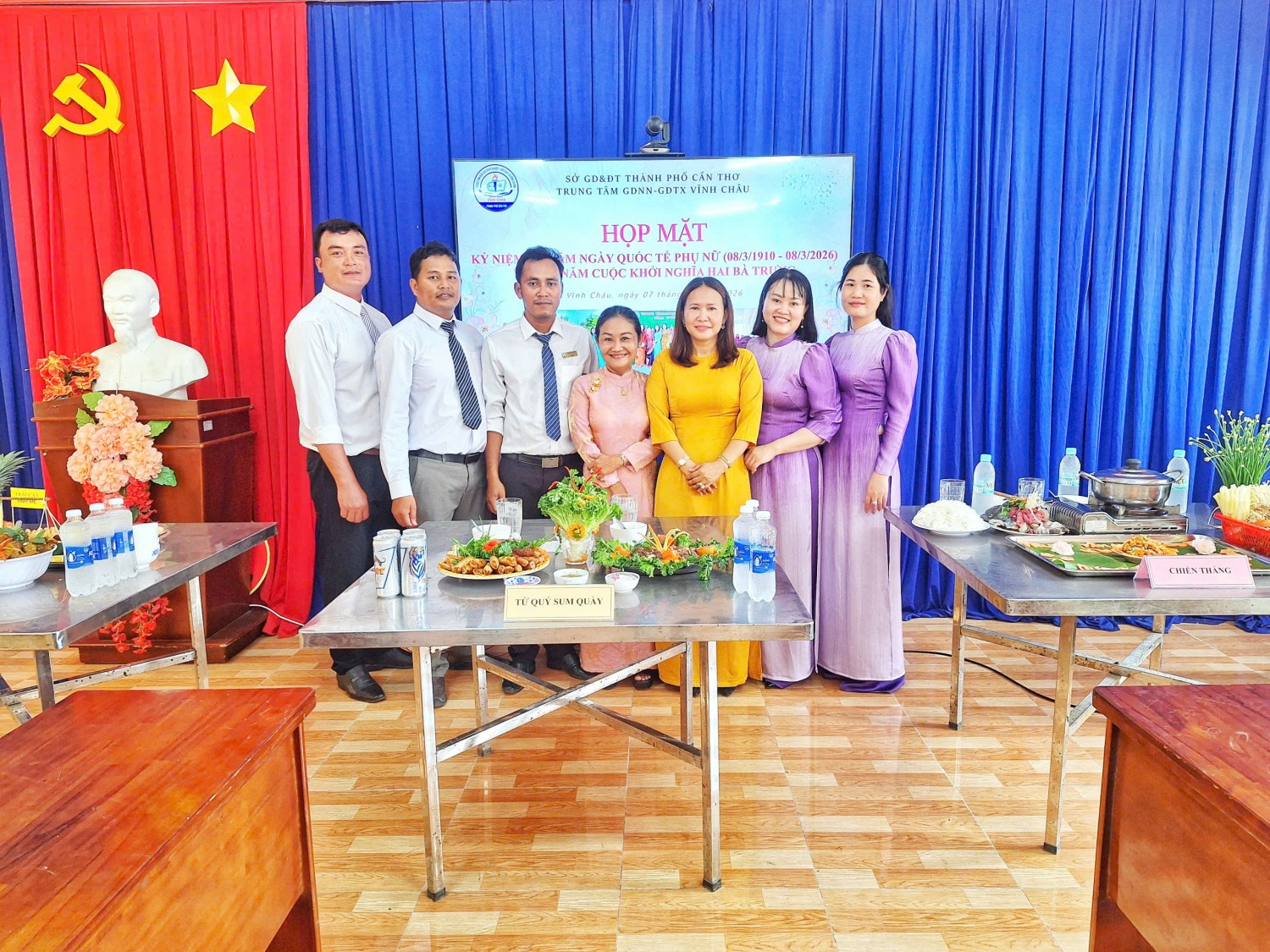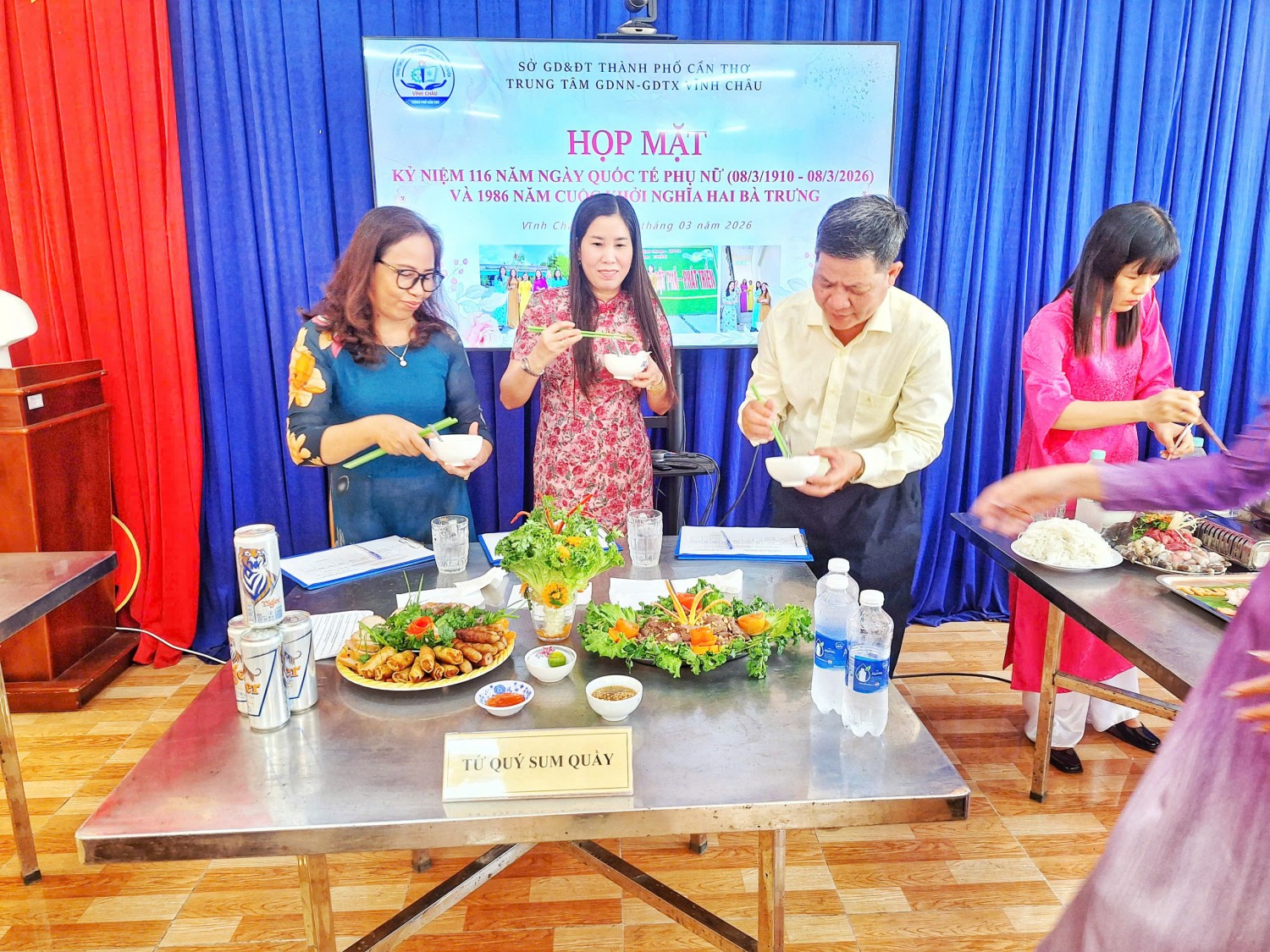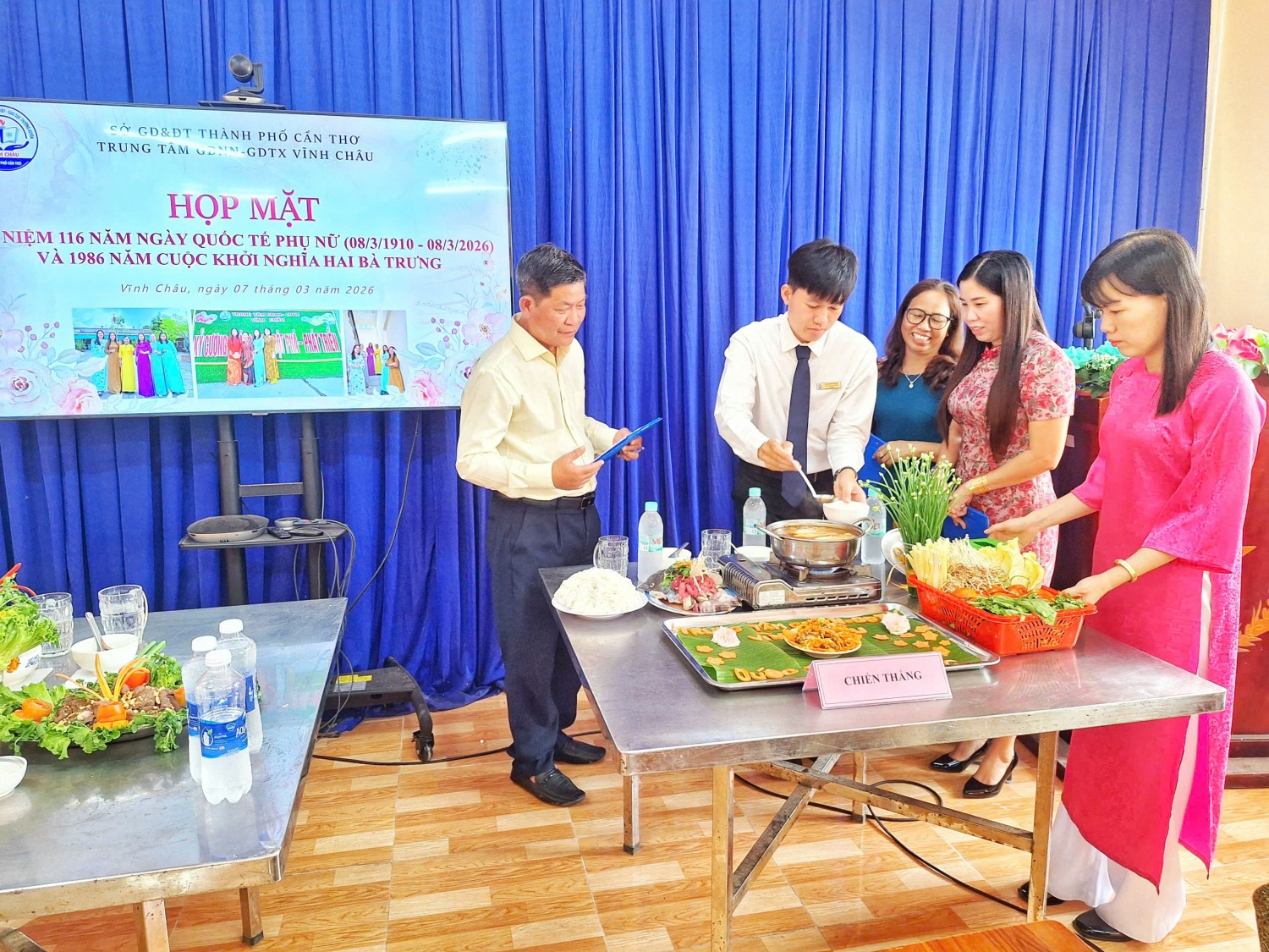 Hòa trong không khí hân hoan kỷ niệm 116 năm Ngày Quốc tế Phụ nữ (08/3/1910 - 08/3/2026) và 1986 năm cuộc khởi nghĩa Hai Bà Trưng, sáng ngày 07/3/2026, Trung tâm GDNN - GDTX Vĩnh Châu đã tổ chức các hoạt động ý nghĩa gồm Hội thi nấu ăn và buổi họp mặt kỷ niệm Ngày Quốc tế Phụ nữ 8/3.