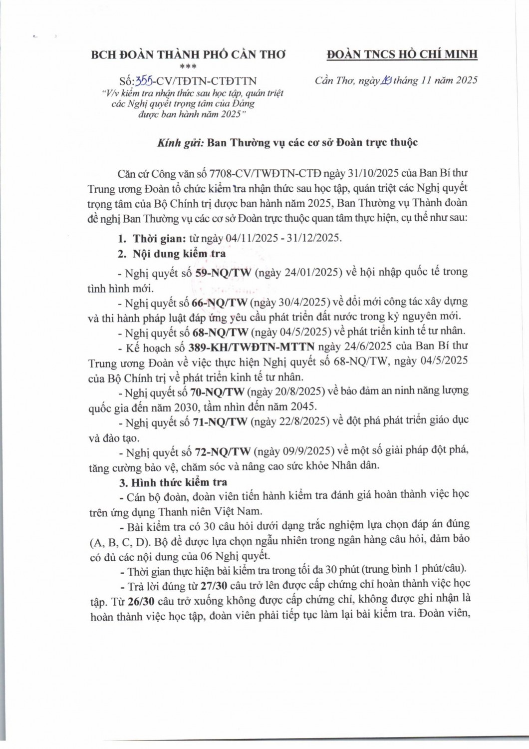 Đoàn Trung tâm GDNN-GDTX thị xã Vĩnh Châu triển khai công văn số 355-CV/TĐTN-CTĐTTN ngày 19/11/2025 của BCH Đoàn thành phố Cần Thơ về việc kiểm tra nhận thức sau học tập, quán triệt các Nghị quyết trọng tâm của Đảng được ban hành năm 2025.