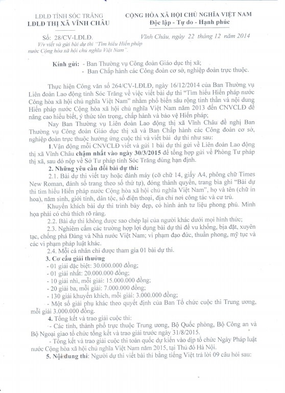 Thông báo viết bài dự thi "tìm hiểu hiến pháp nước cộng hòa xã hội chủ nghĩa việt nam"