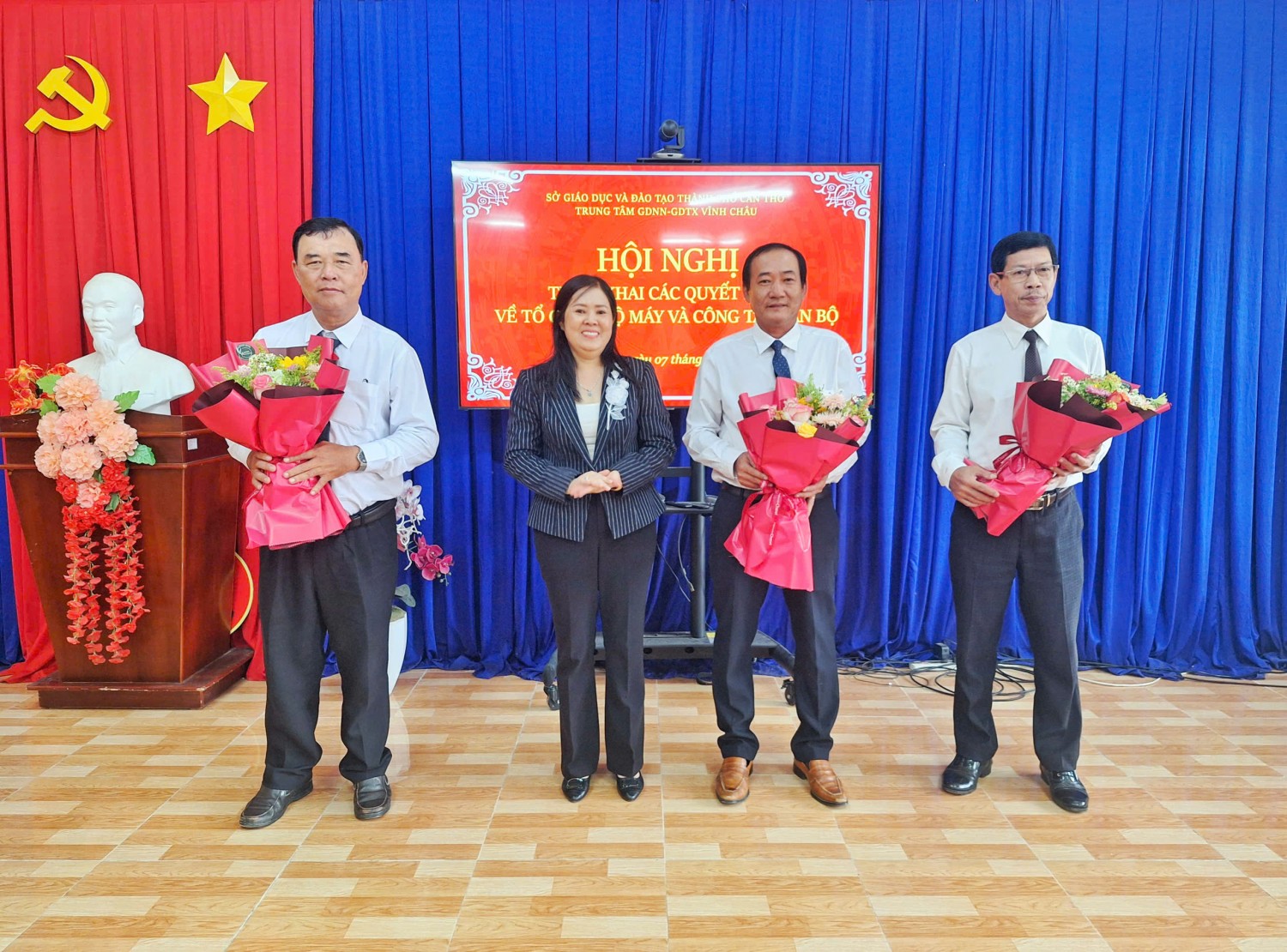 Tại Hội nghị đồng chí Trần Nhuận Thanh Liêm - Bí thư Chi bộ, Giám đốc Trung tâm đã triển khai các quyết định về việc sáp nhập các Trung tâm GDNN-GDTX và đổi tên thành Trung tâm GDNN-GDTX trực thuộc Sở Giáo dục và Đào tạo; Quyết định điều đồng viên chức, người lao động đến công tác tại Trung tâm GDNN-GDTX Vĩnh Châu; Quyết định bổ nhiệm viên chức quản lý Trung tâm.