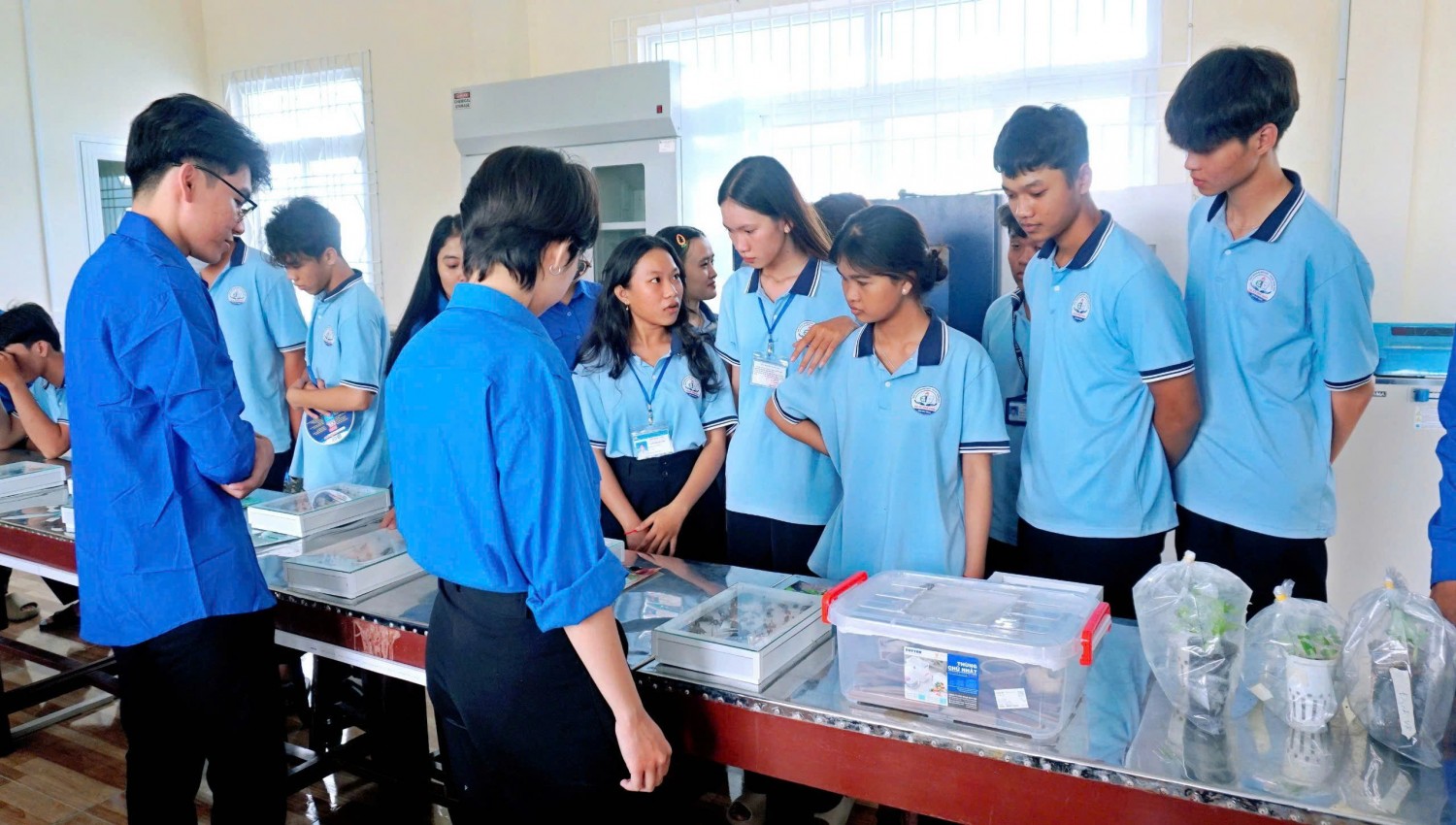 Trong buổi làm việc này, các em học viên của Trung tâm đã có cơ hội trực tiếp tham quan, trải nghiệm thực tế và tìm hiểu về các ngành đào tạo tại trường. Các em được giới thiệu về cơ sở vật chất phục vụ giảng dạy và học tập, bao gồm: Ký túc xá; Phòng Thí nghiệm Trung tâm Nông nghiệp Công nghệ cao; mô hình thủy sản với hệ thống RAS nuôi cá chình và mô hình Biofloc nuôi tôm tại Trại thực nghiệm - Khoa Nông nghiệp và Thủy sản. Bên cạnh đó, các em còn được tham quan và trải nghiệm công nghệ 4.0 tại phòng máy tính, phòng thực hành IOT - Khoa Kỹ thuật và Công nghệ, cũng như trải nghiệm nhà giáo tương lai viết chữ đẹp.