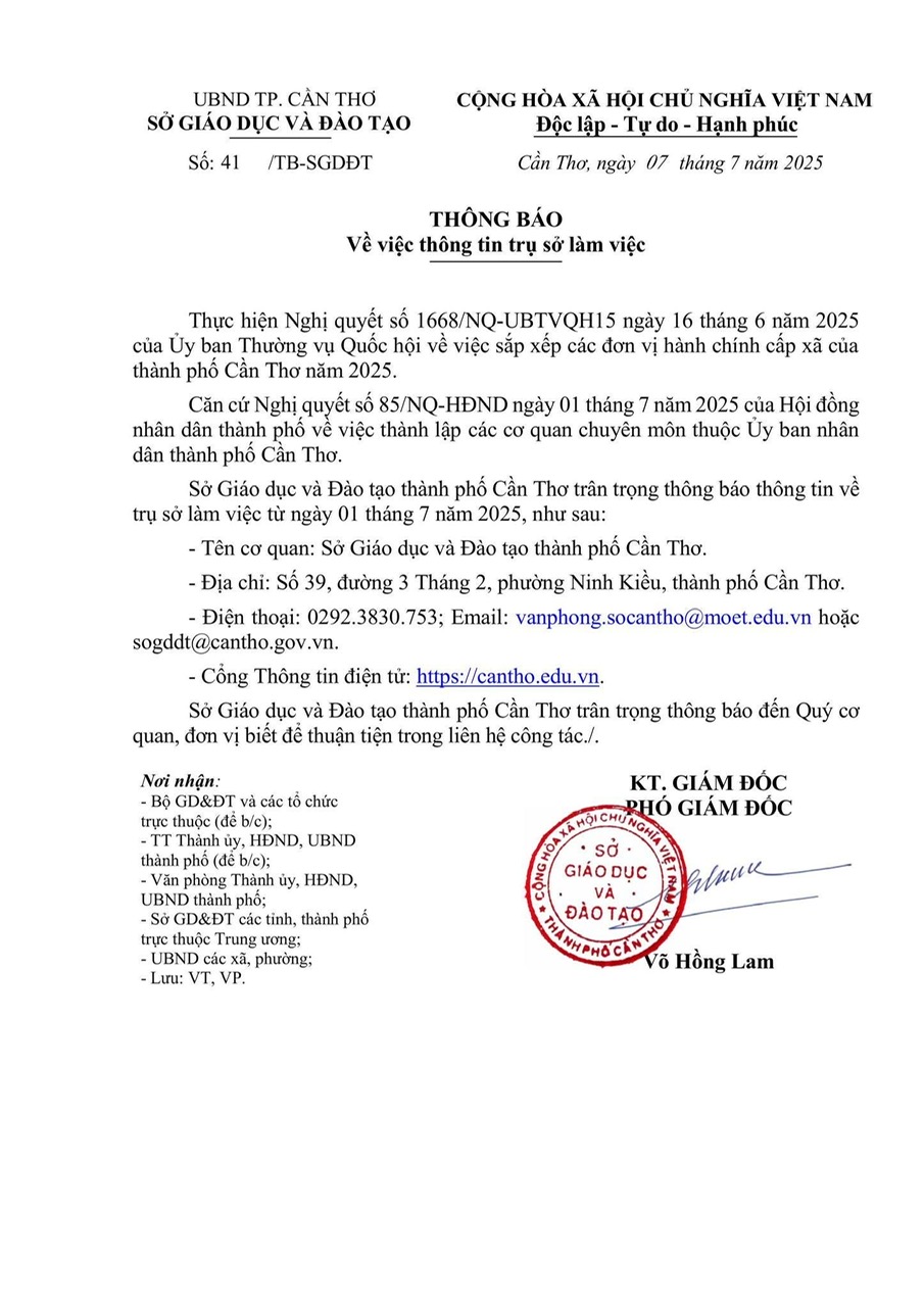 Sở Giáo dục và Đào tạo thành phố Cần Thơ trân trọng thông báo thông tin về trụ sở làm việc từ ngày 01 tháng 7 năm 2025, như sau: