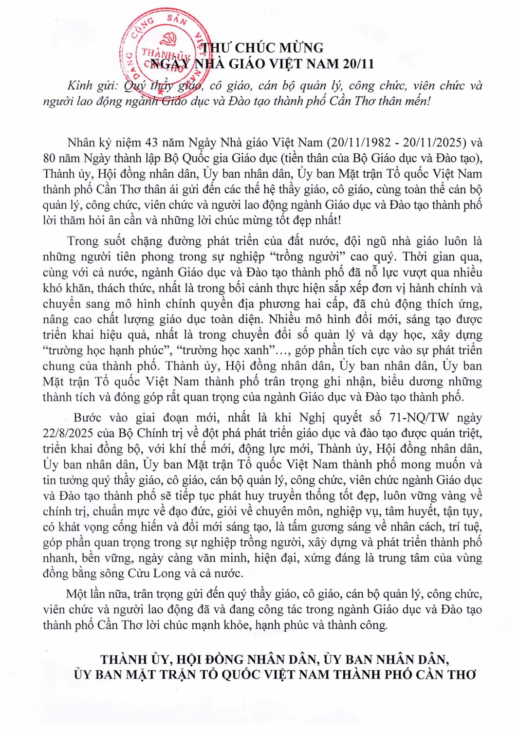 “Thư chúc mừng ngày Nhà giáo Việt Nam 20/11” của Thành ủy, Hội đồng nhân dân, Ủy ban nhân dân, Ủy ban Mặt trận Tổ quốc Việt Nam thành phố Cần Thơ